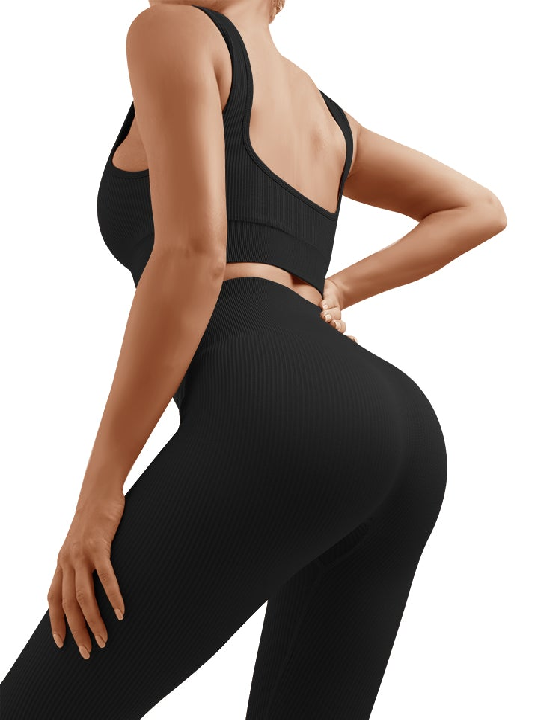 - Ribbed leggings and square-cut sports bra: Slim fit, tuck in and lift your hips perfectly to show your body curve. The special ribbed texture helps to keep it in place during exercise and is non-slip. There are two different collar designs, square cut and V-shaped.